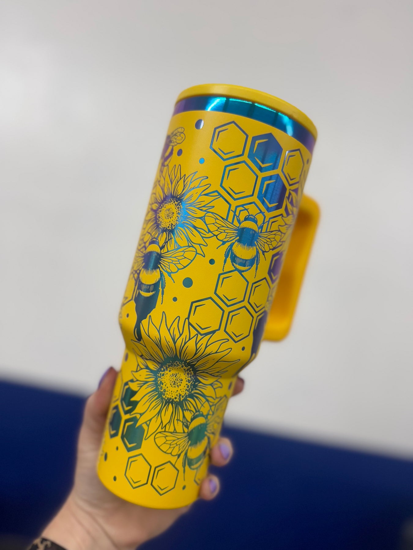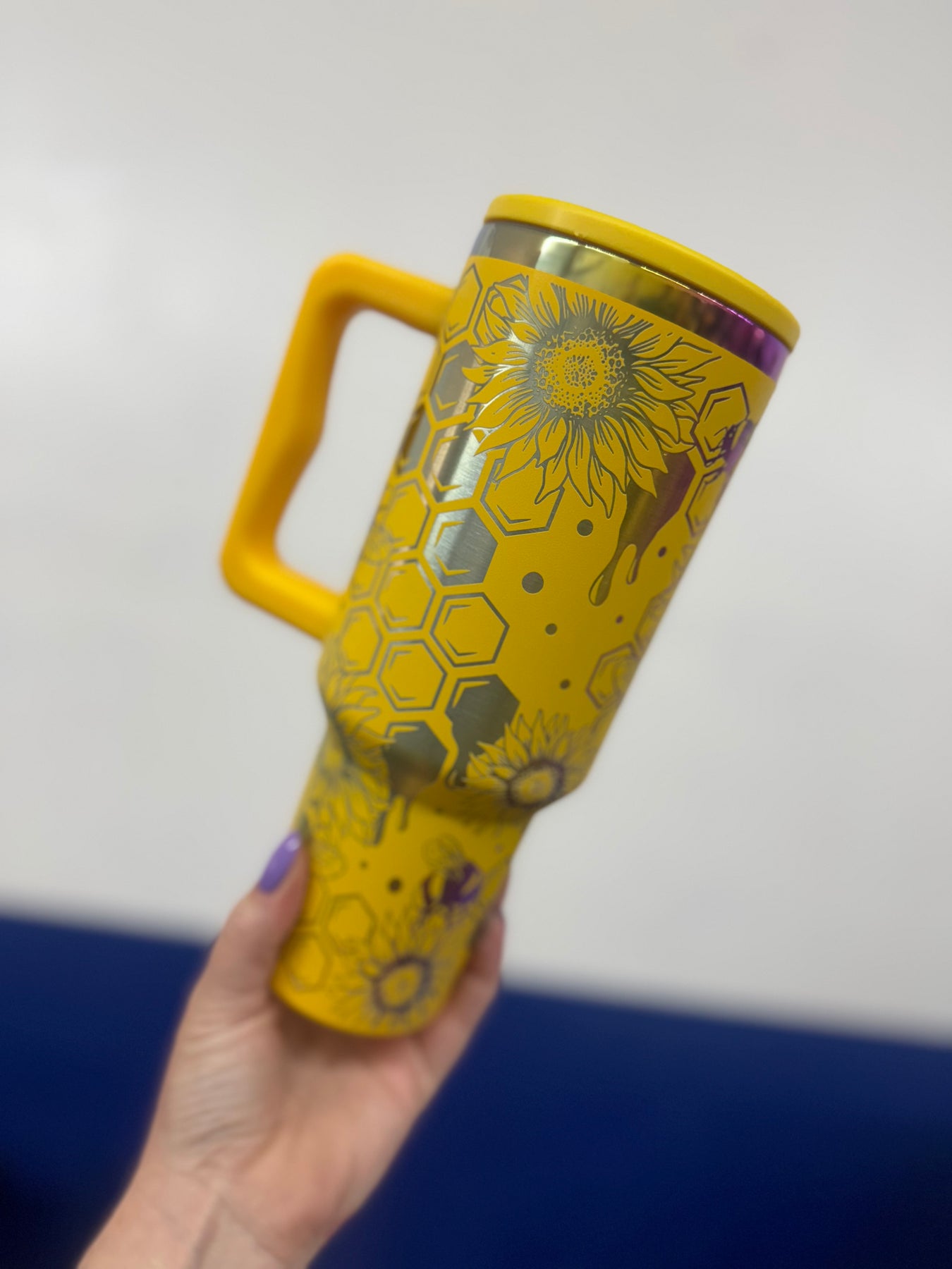 - 40 oz Stainless Steel Double Wall Power Coat Tumblers with Handle and Lids that have a silicone Insert! These have a Rainbow Electroplated Underlay.