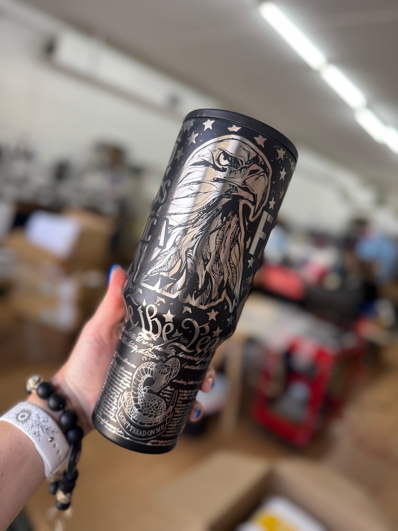 - 40 oz Stainless Steel Double Wall Power Coat Tumblers with Handle and Lids that have a silicone Insert! These have a Rainbow Electroplated Underlay.