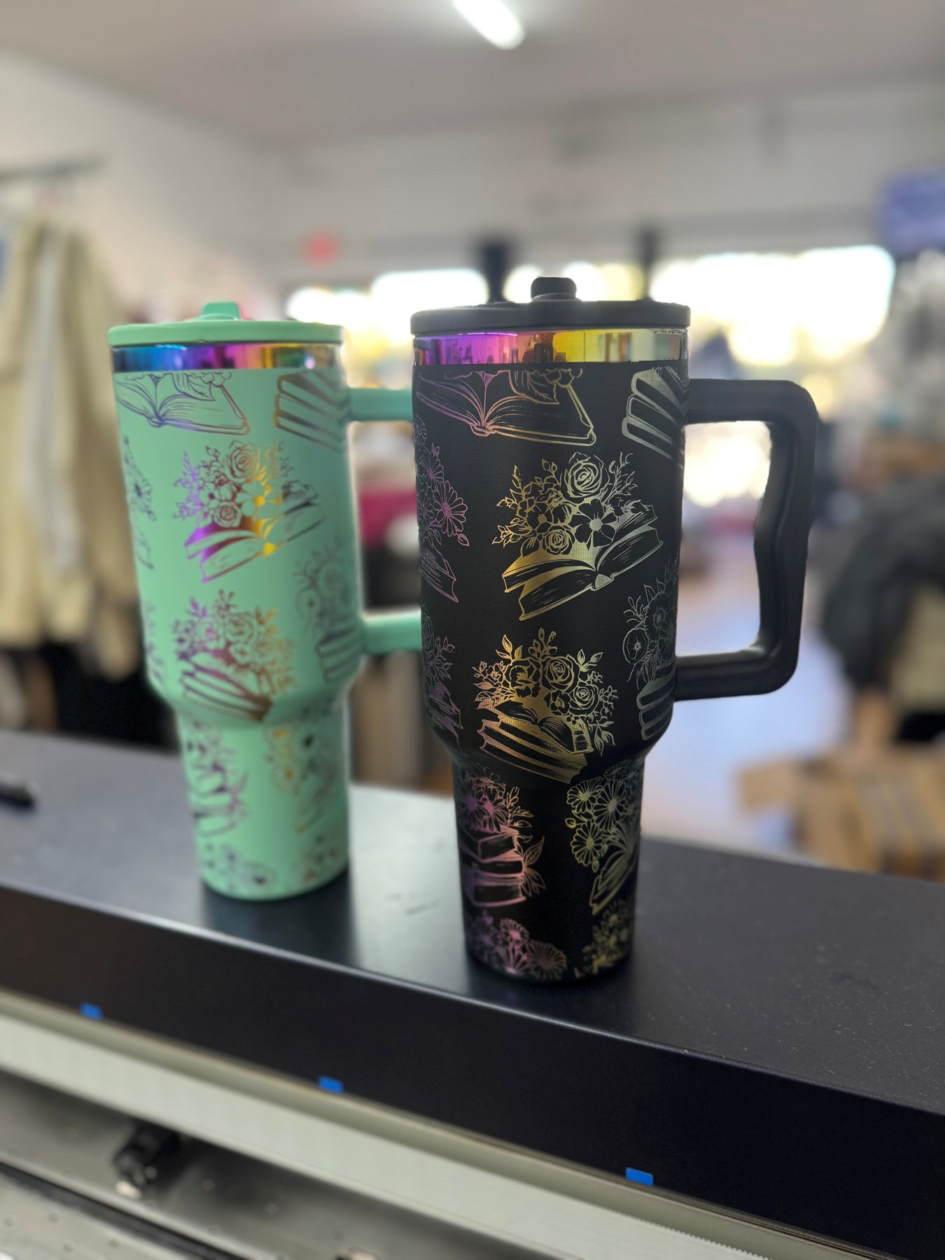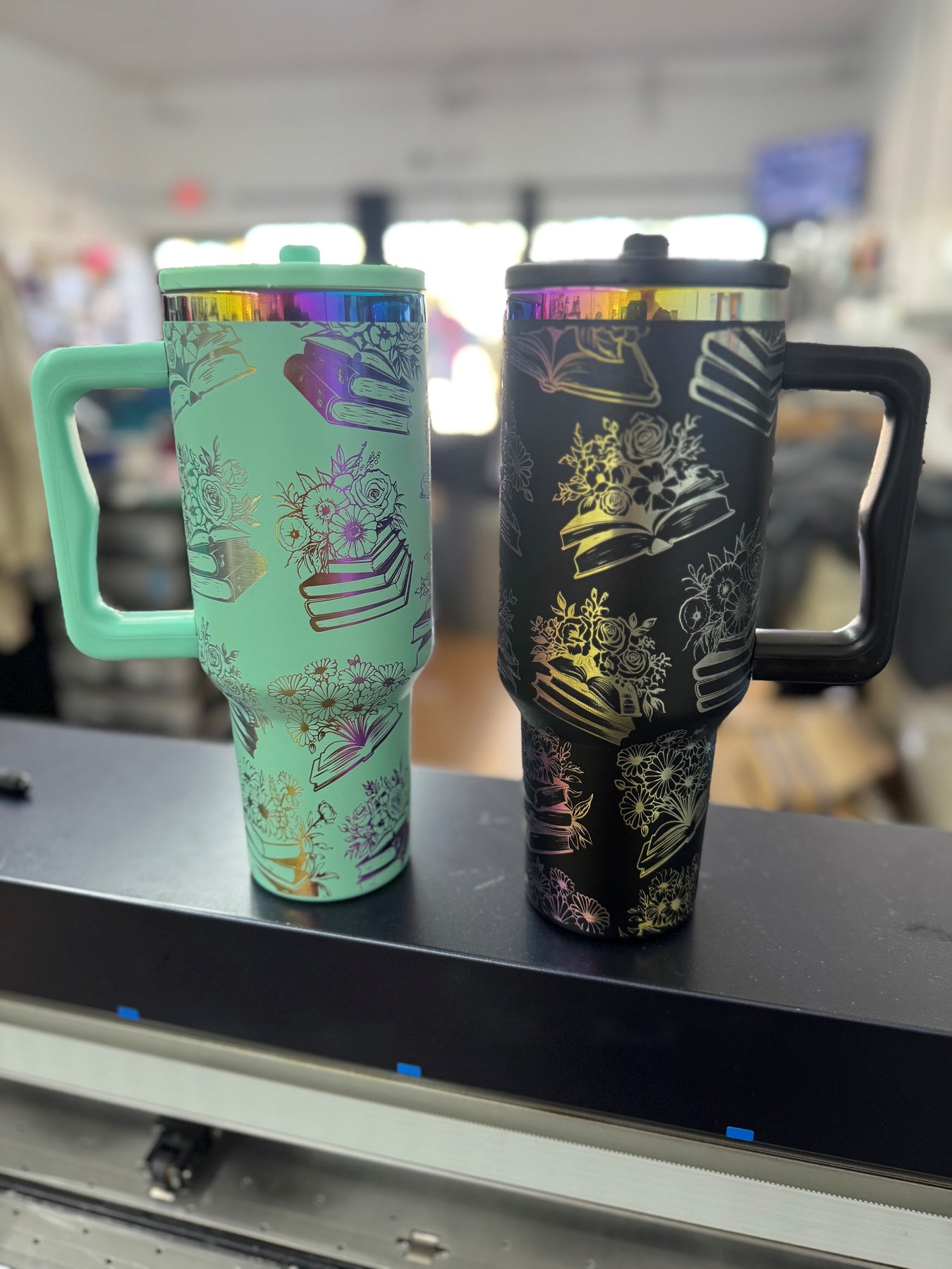 - 40 oz Stainless Steel Double Wall Power Coat Tumblers with Handle and Lids that have a silicone Insert! These have a Rainbow Electroplated Underlay.