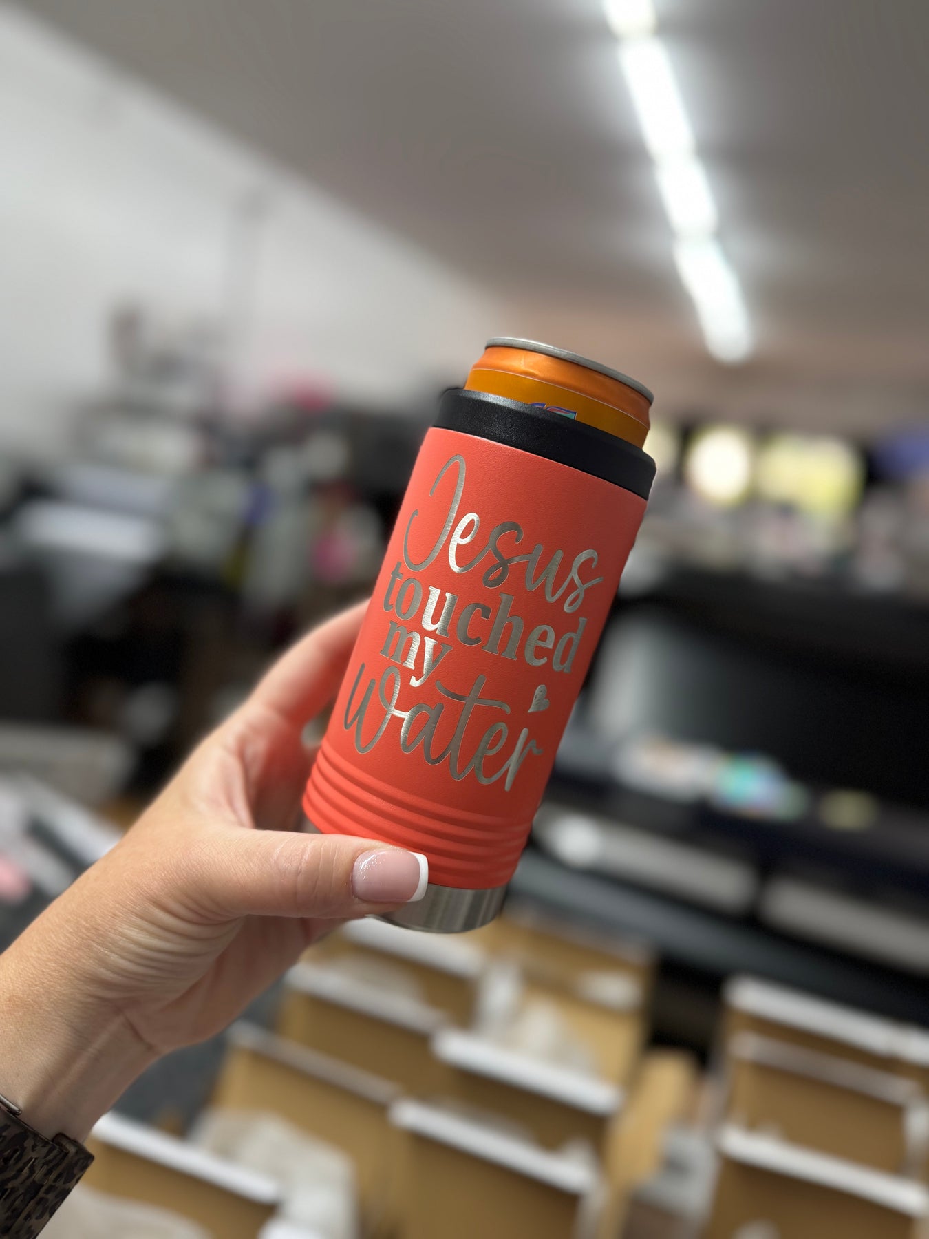 Jesus Touched My Water | Skinny Can Cooler | Laser Engraved