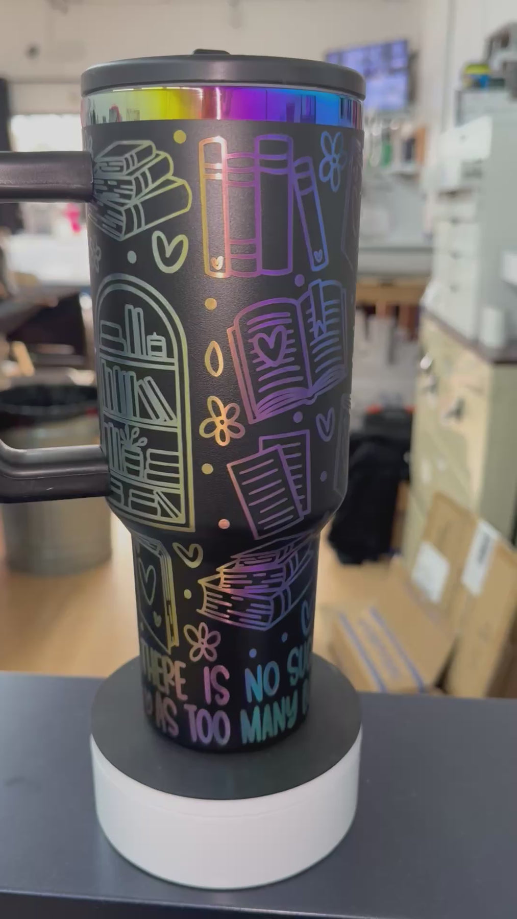 • 40 oz Stainless Steel Double Wall Power Coat Tumblers with Handle and Lids that have a silicone Insert!  These have a Rainbow Electroplated Underlay.