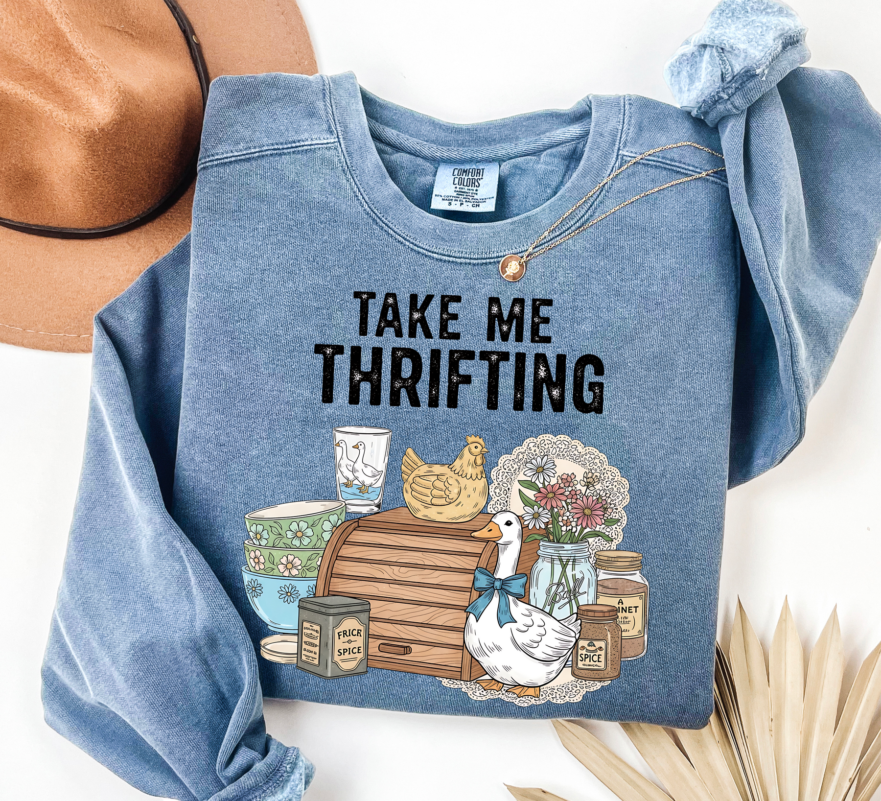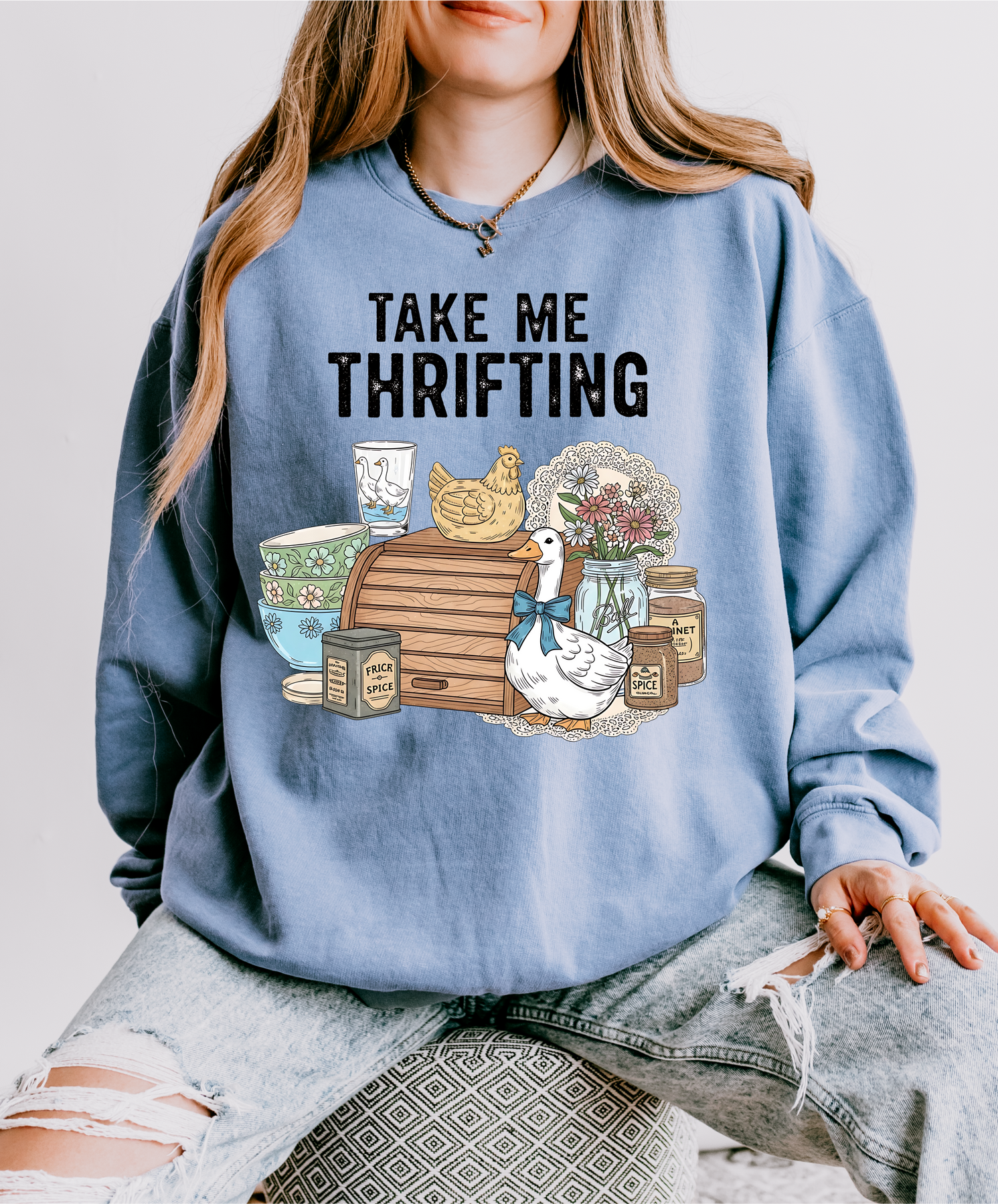 This listing is for a custom comfort colors crewneck, perfect for Thriftin' friends!